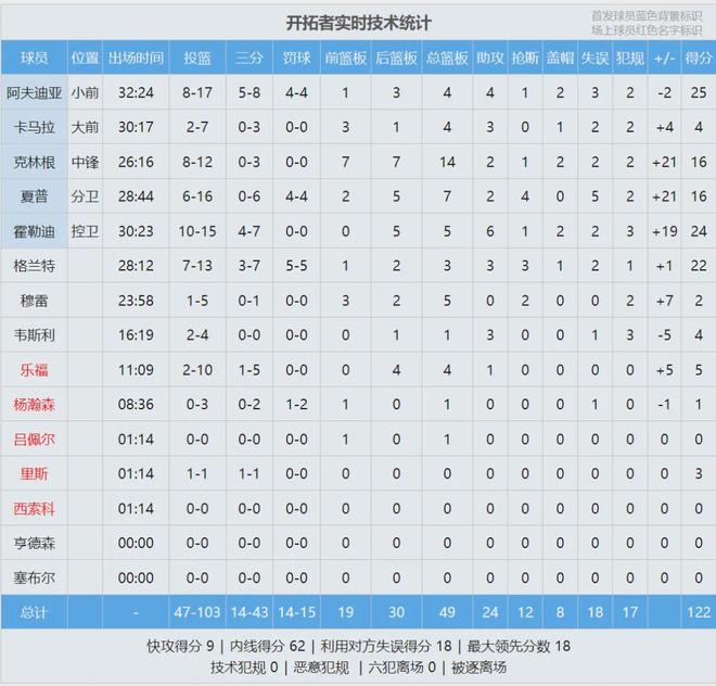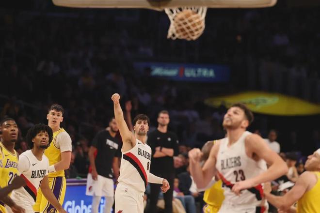 第四節(jié)霍勒迪兩記三分,開拓者領先到18分??肆指芜M攻得手,防守端大帽里夫斯。楊瀚森的護框和防守,和克林根還有不小差距。最后1分14秒,垃圾時間楊瀚森再次登場,但沒機會觸球。全場結(jié)束,開拓者122-108大勝湖人。