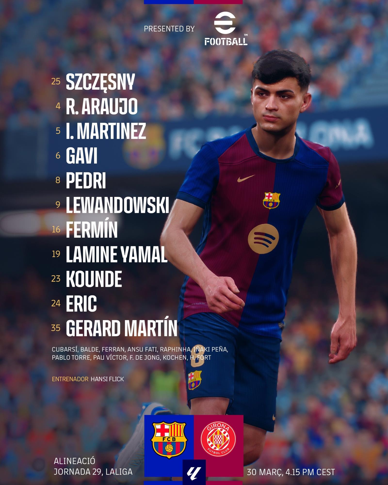 巴薩首發(fā):25-什琴斯尼、4-阿勞霍、5-伊尼戈-馬丁內(nèi)斯、23-孔德、24-埃里克-加西亞、35-杰拉德-馬丁、6-加維、8-佩德里、16-費爾明、19-亞馬爾、9-萊萬