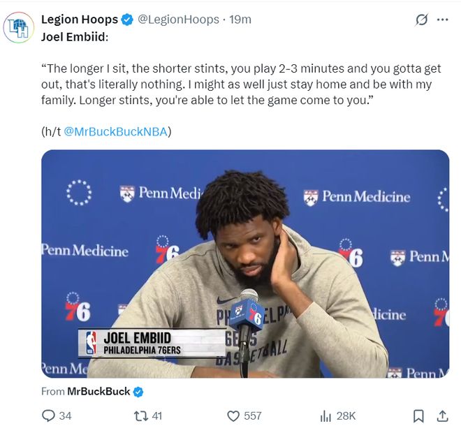 賽后恩比德對自己的登場時間限制非常不滿,他說道:我在板凳席坐著的時間比登場的時間還多,我登場2-3分鐘就得被換下來,這怎么玩?我還不如待在家里陪家里人呢!上場時間足夠才能讓自己逐漸適應比賽的節(jié)奏。